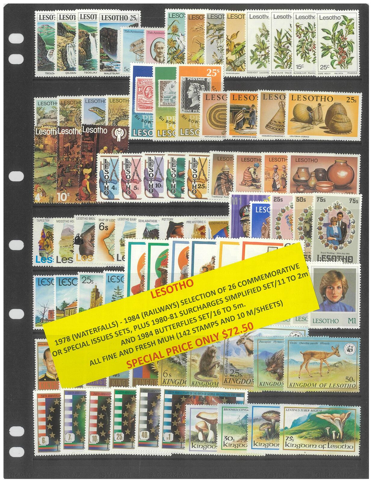 Lesotho 1978 (Waterfalls) - 1984 (Railways) Selection of 26 Commemorative Sets, plus 1980-81 Surcharges simplified set of 11 and 1984 Butterflies set of 16. 142 Stamps & 10 Mini Sheets MUH #422