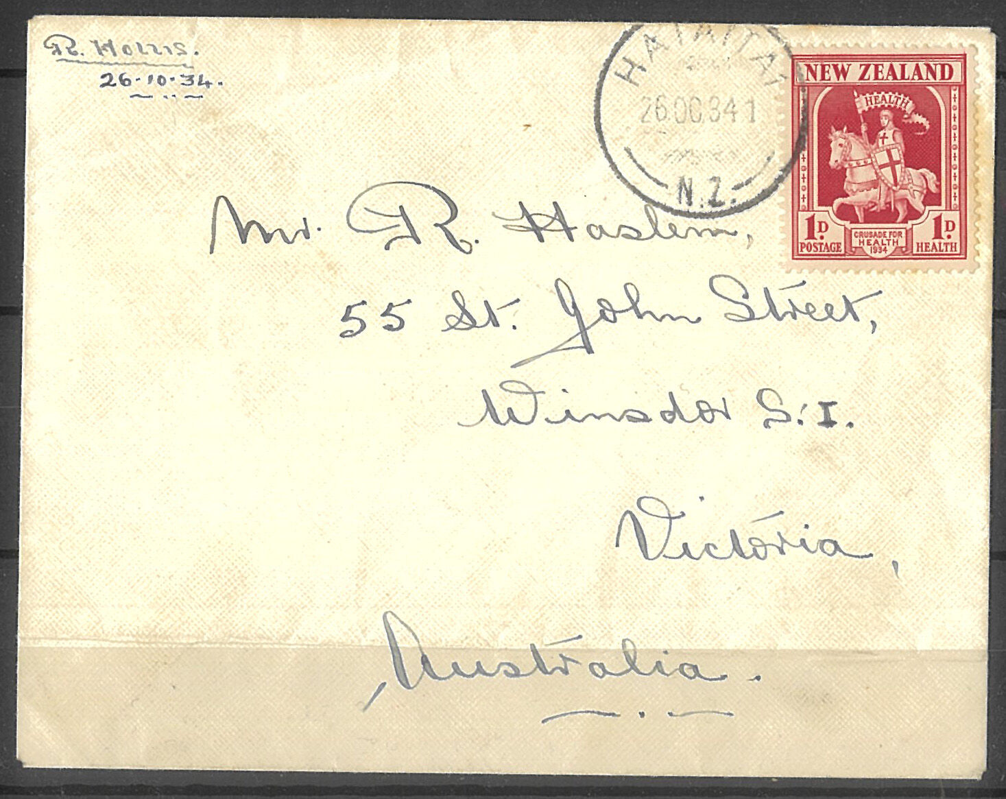 New Zealand 1934 Health Stamp on Plain Cover to "Australia with Hataitai CDS of 26 Oct 31"