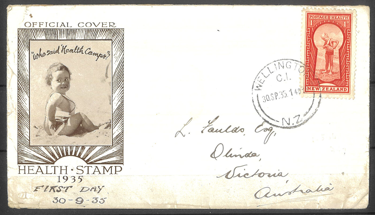 New Zealand 1935 Health Stamp on First Day Cover tied by "Wellington C.1 CDS on 30 SP 35"