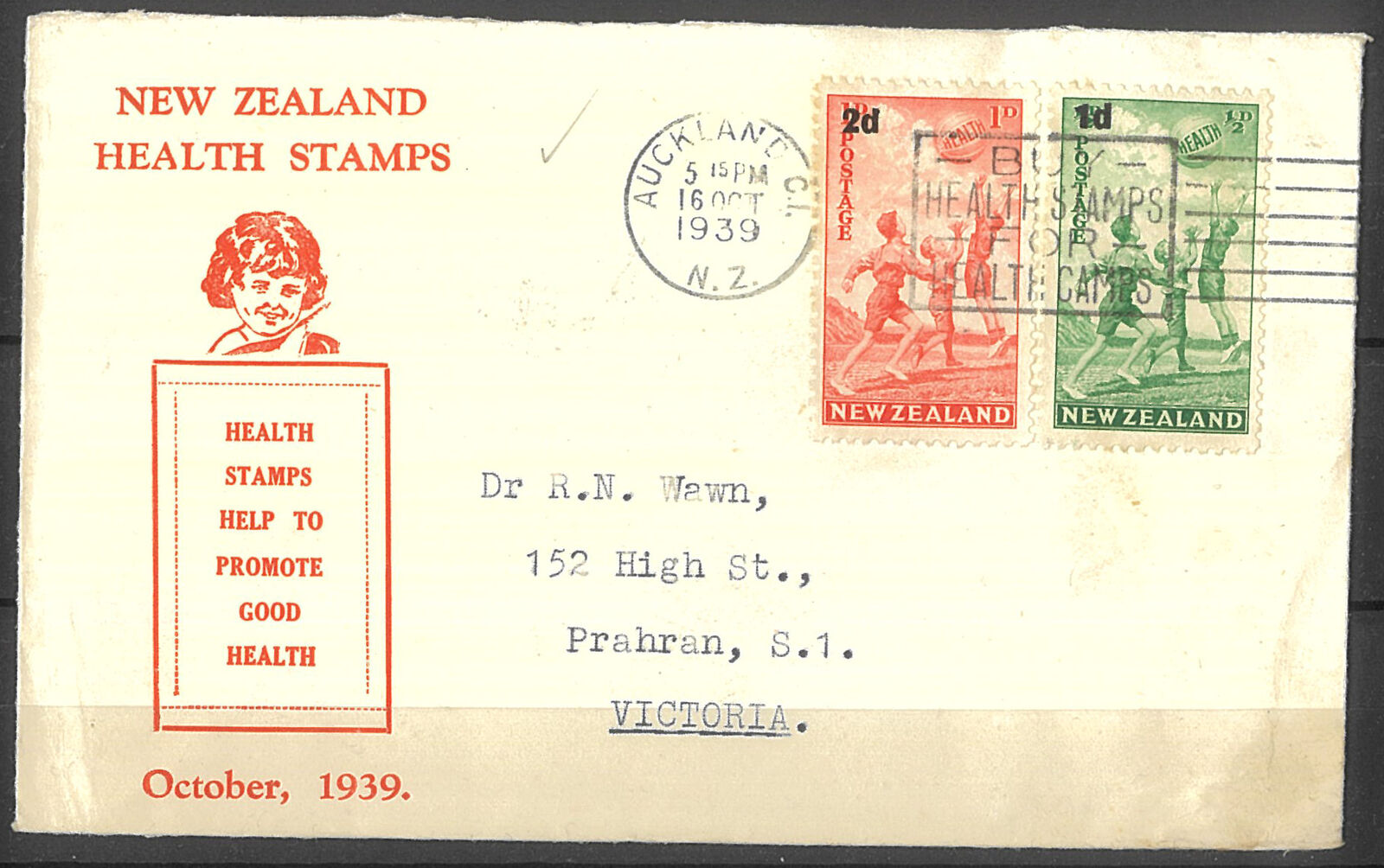 New Zealand 1939 Health Set/2 Stamps on First Day Cover, tied by "Auckland Meter Cancel of 16 Oct 1939"