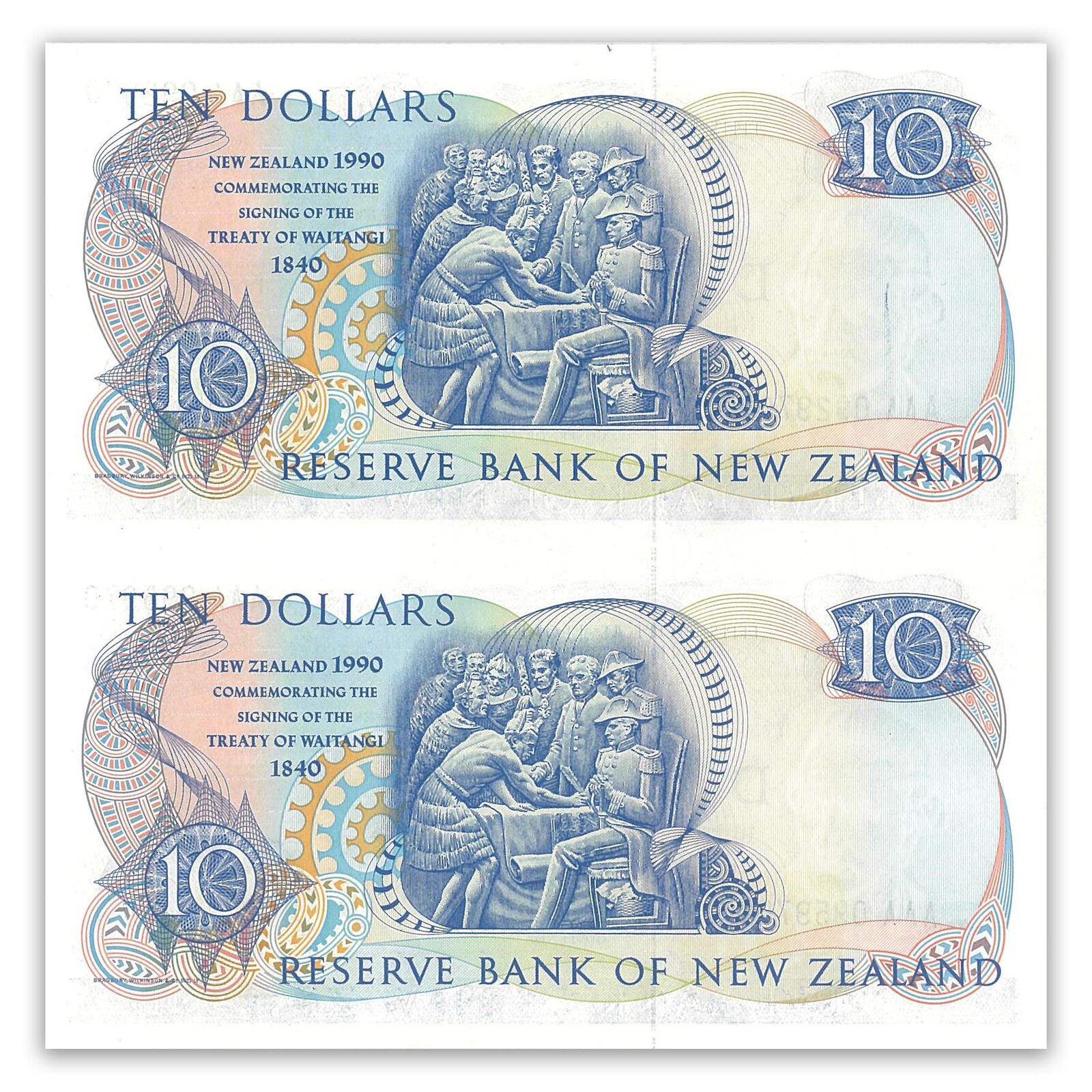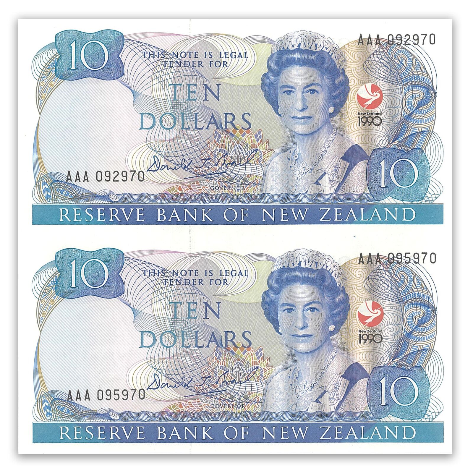 This rare and highly collectible uncut pair of $10 banknotes was issued by the Reserve Bank of New Zealand in 1990.