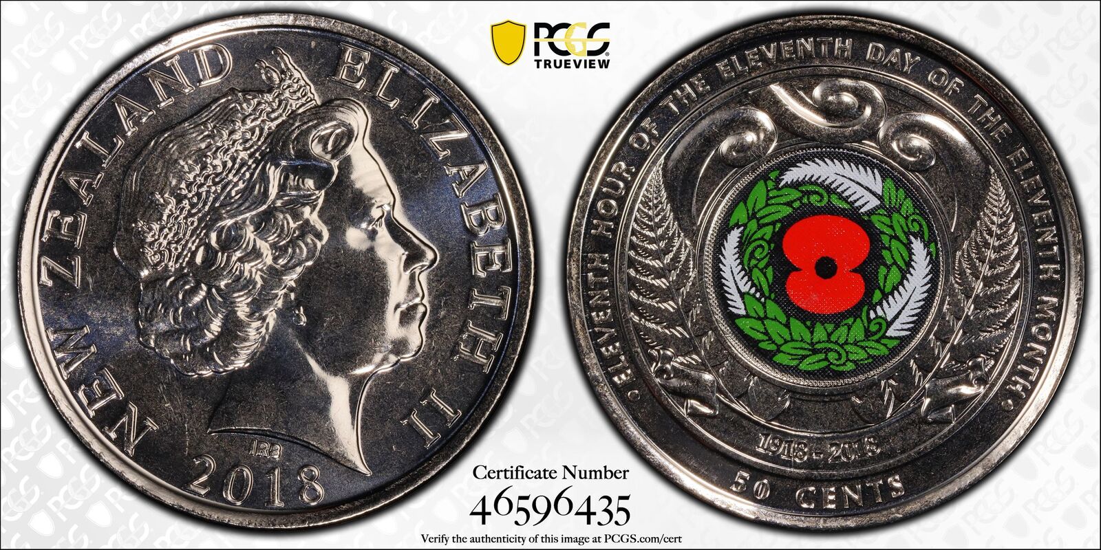 New Zealand 2018 Armistice Centenary 50c Coloured Coin PCGS MS67