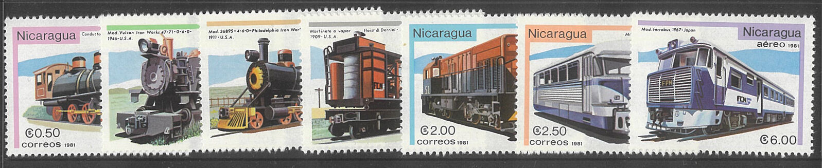 Nicaragua 1981 Trains Set of 7 Stamps Scott 1133/38 C992 MUH 6-1