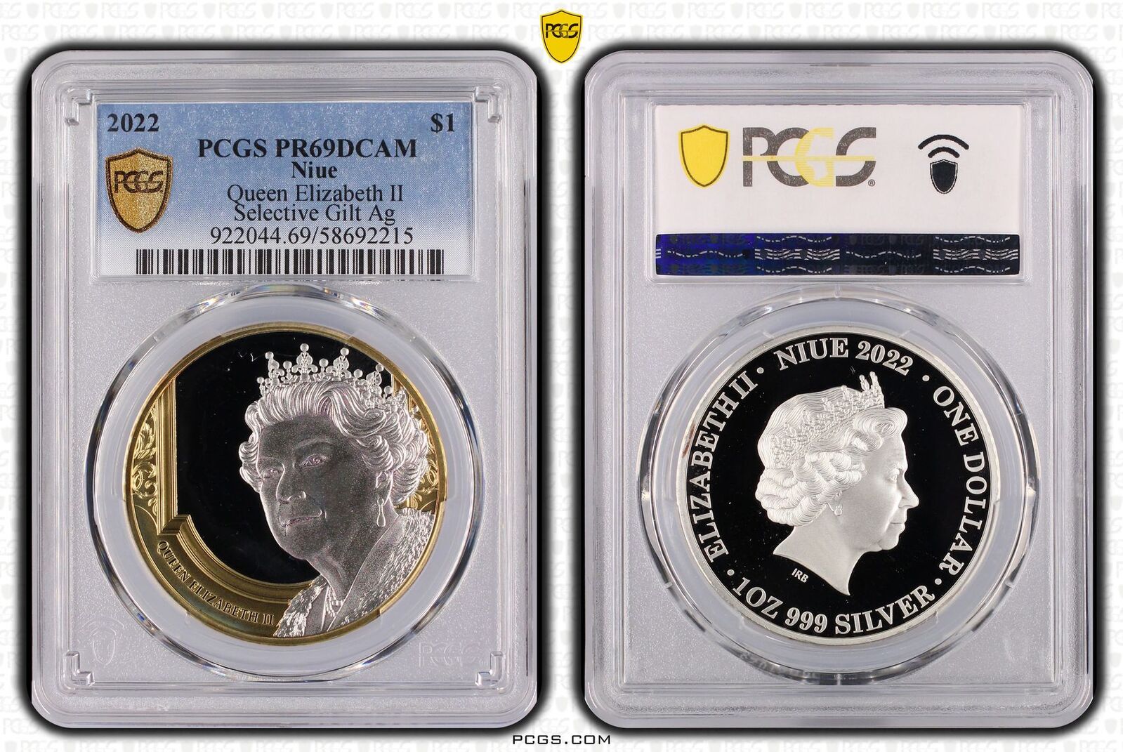 Niue 2022 $1 Queen Elizabeth II Selective Gilt Silver Coin PCGS PR69DCAM