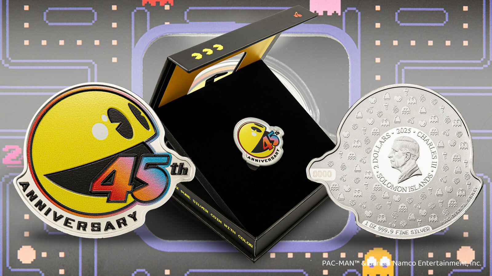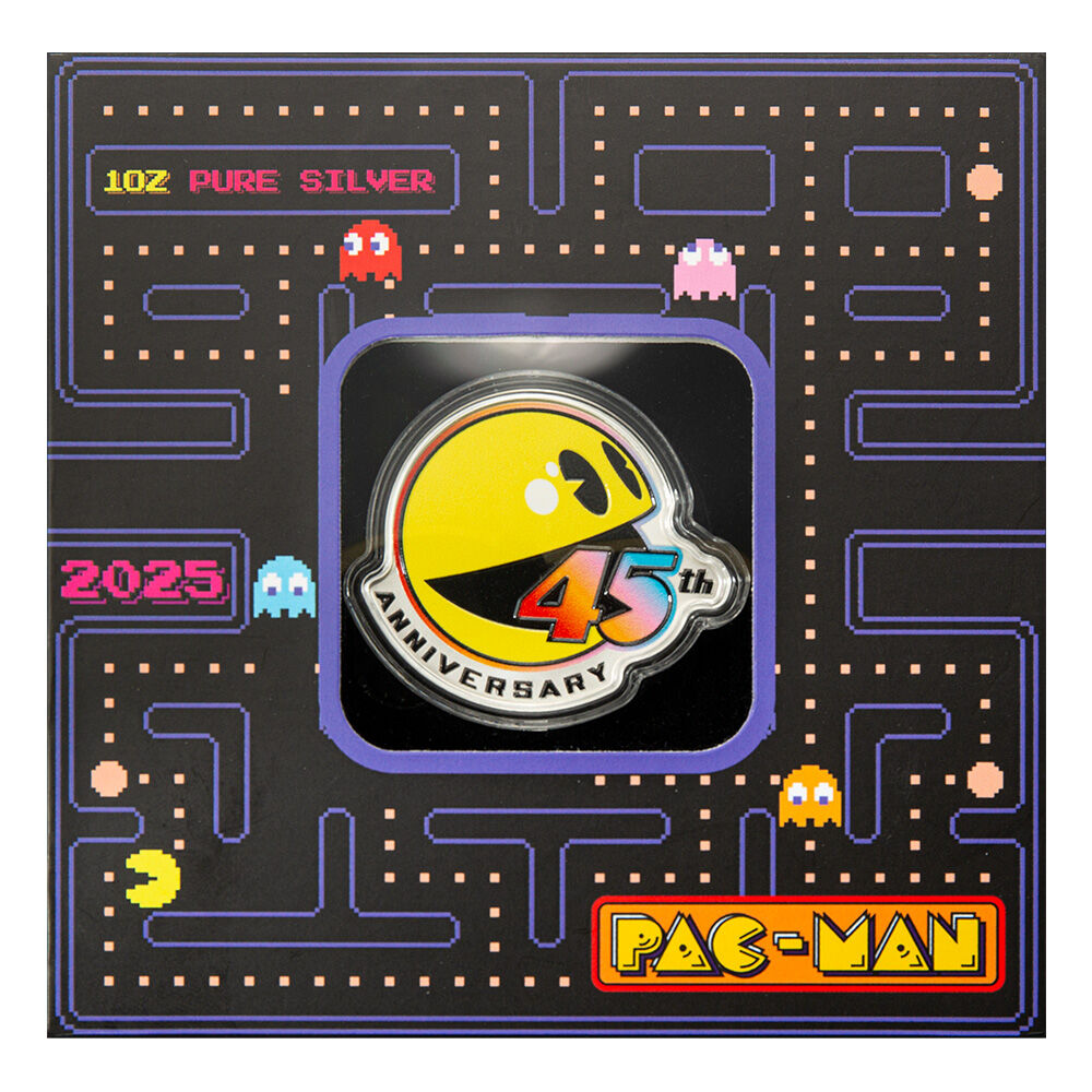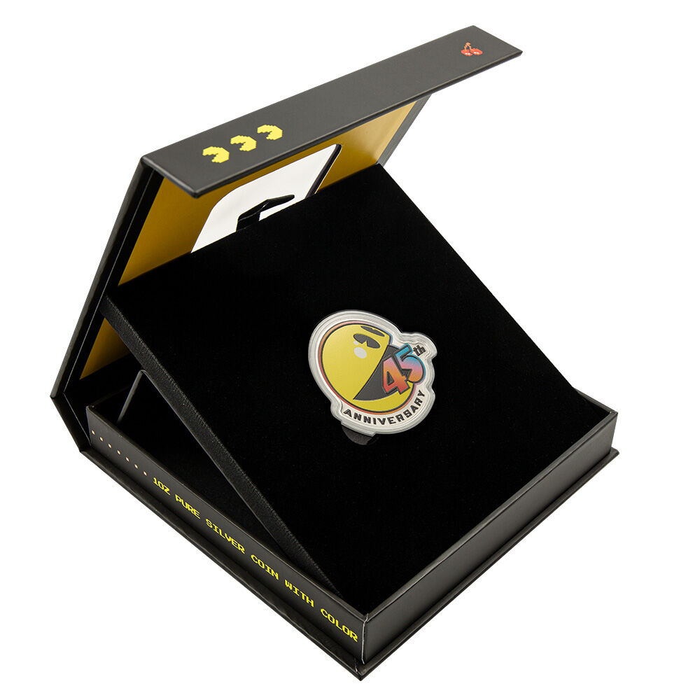 Over the years, PAC-MAN has become a symbol of nostalgia and fun. Today, PAC-MAN resonates with all generations, remaining a cool, colorful and timeless character. This silver colorized coin celebrates the 45th anniversary of the iconic arcade game, a global pop culture phenomenon! Each coin is individually serialized and housed in a custom capsule in a displayable presentation case. Limited mintage of 2,000 coins.