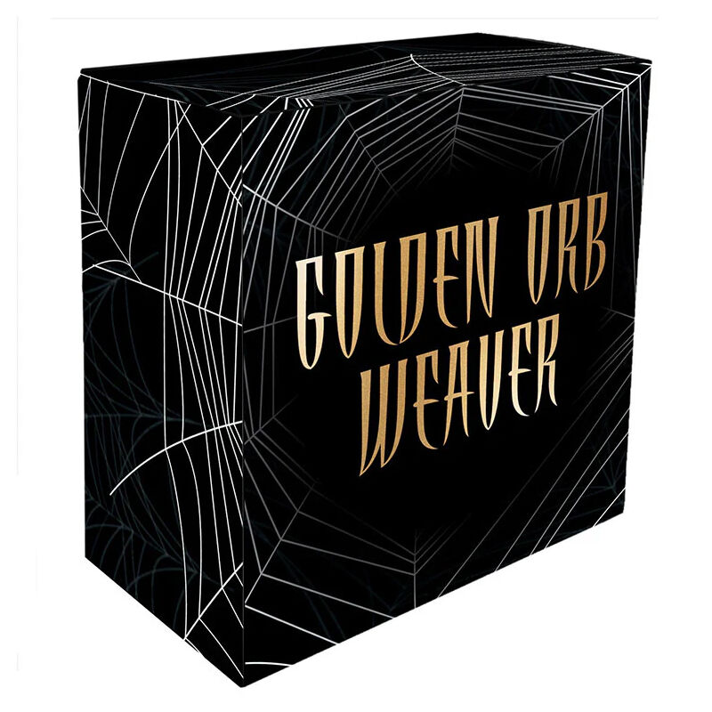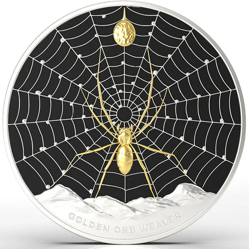 As the subject of this one ounce, 99.9% pure silver coin, the Golden Orb Spider looks resplendent in selective gold plating with its beautiful web stretched out beneath. Enhancing both the curves and the brilliant precious metal, the background features a deep black metallic background.