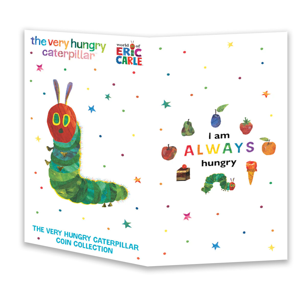 This officially licensed set includes eight 50 cent coins, each .999 silver plated and finished in full colour. The reverse designs follow the iconic food journey from Eric Carle’s classic tale, featuring the familiar fruits and treats alongside The Very Hungry Caterpillar™ himself.