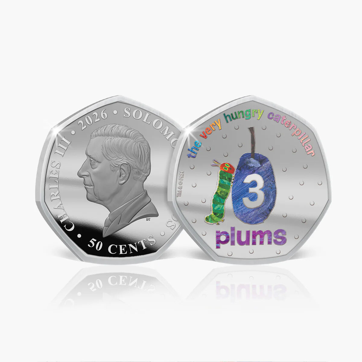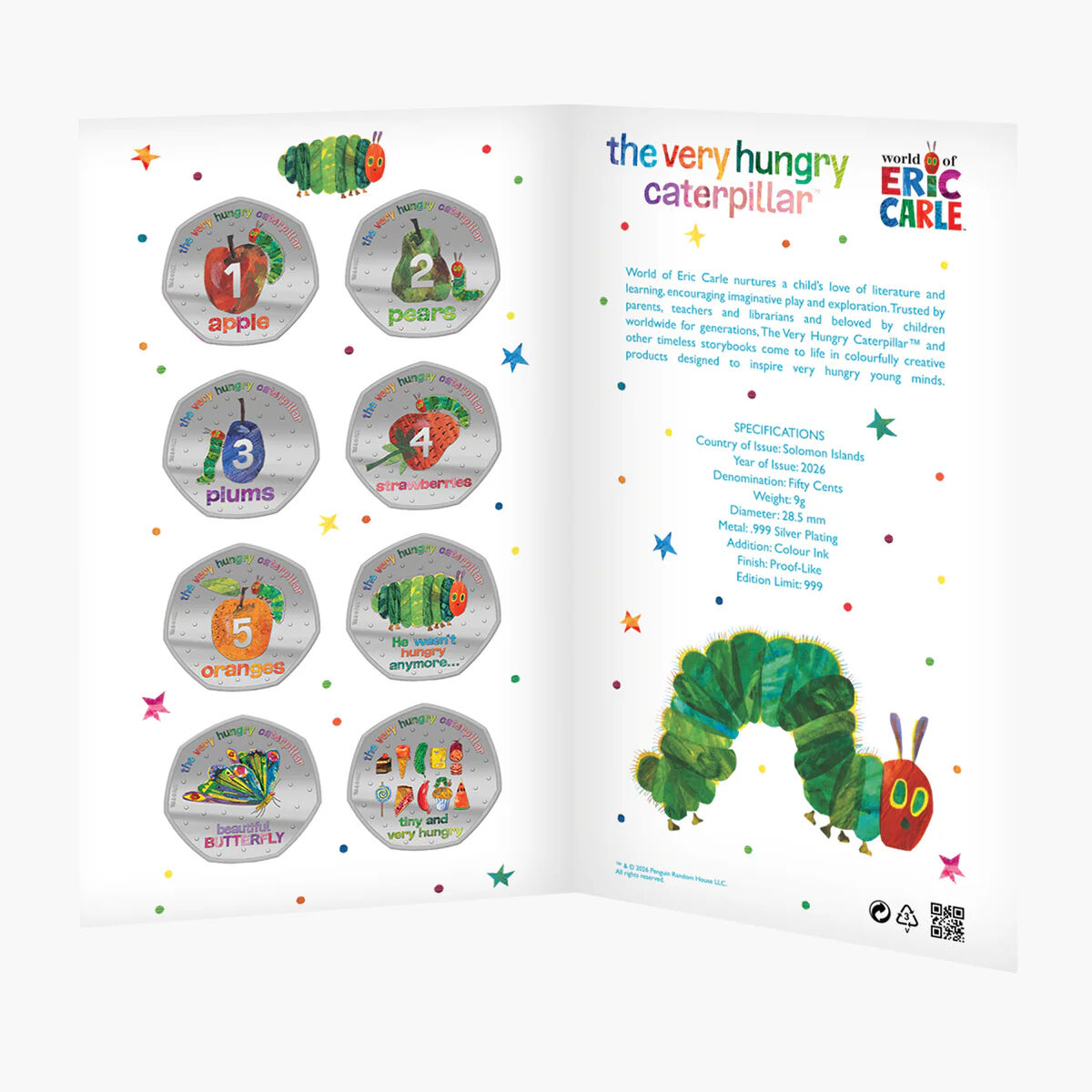 Issued in 2026 on behalf of the Solomon Islands, each coin shares a common obverse and is brought together in a specially designed collector folder themed to The Very Hungry Caterpillar. The result is a joyful and nostalgic collection that brings the story to life through colour and detail.