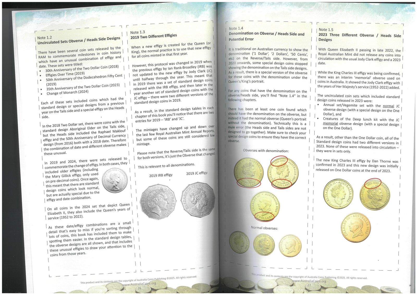 There is also a chapter about the various effigies and designs used on the obverse (heads side) of Australian Coins, including information about errors and subtle changes to watch for.