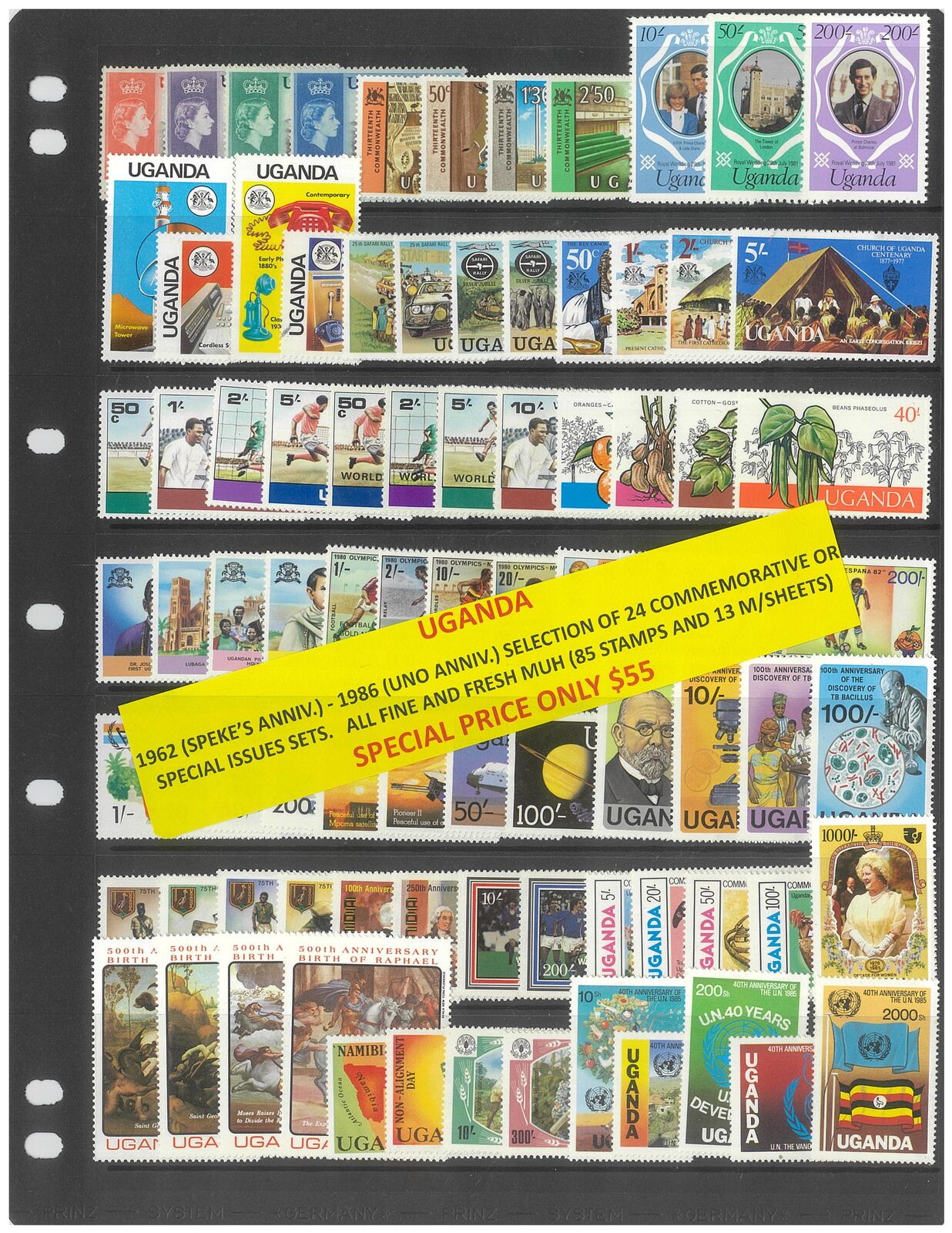 Uganda 1962 (Speke's Anniversary) - 1986 (UNO Anniversary) Selection of 24 Commemorative Sets 85 Stamps & 13 Mini Sheets MUH #414
