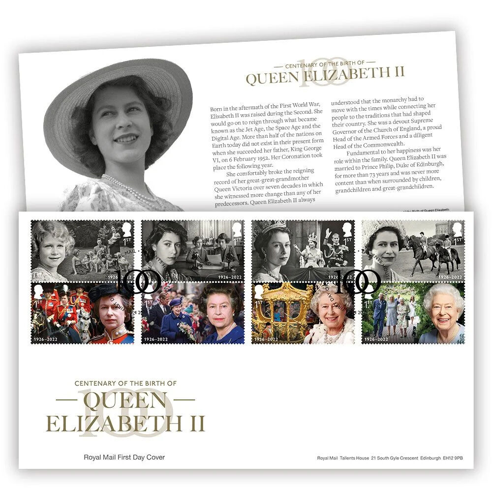 A unique, time-limited collectible commemorating the 100th anniversary of Queen Elizabeth II’s birth is cancelled with the Tallents House special-edition postmark on the first day of issue, 21 April 2026.
