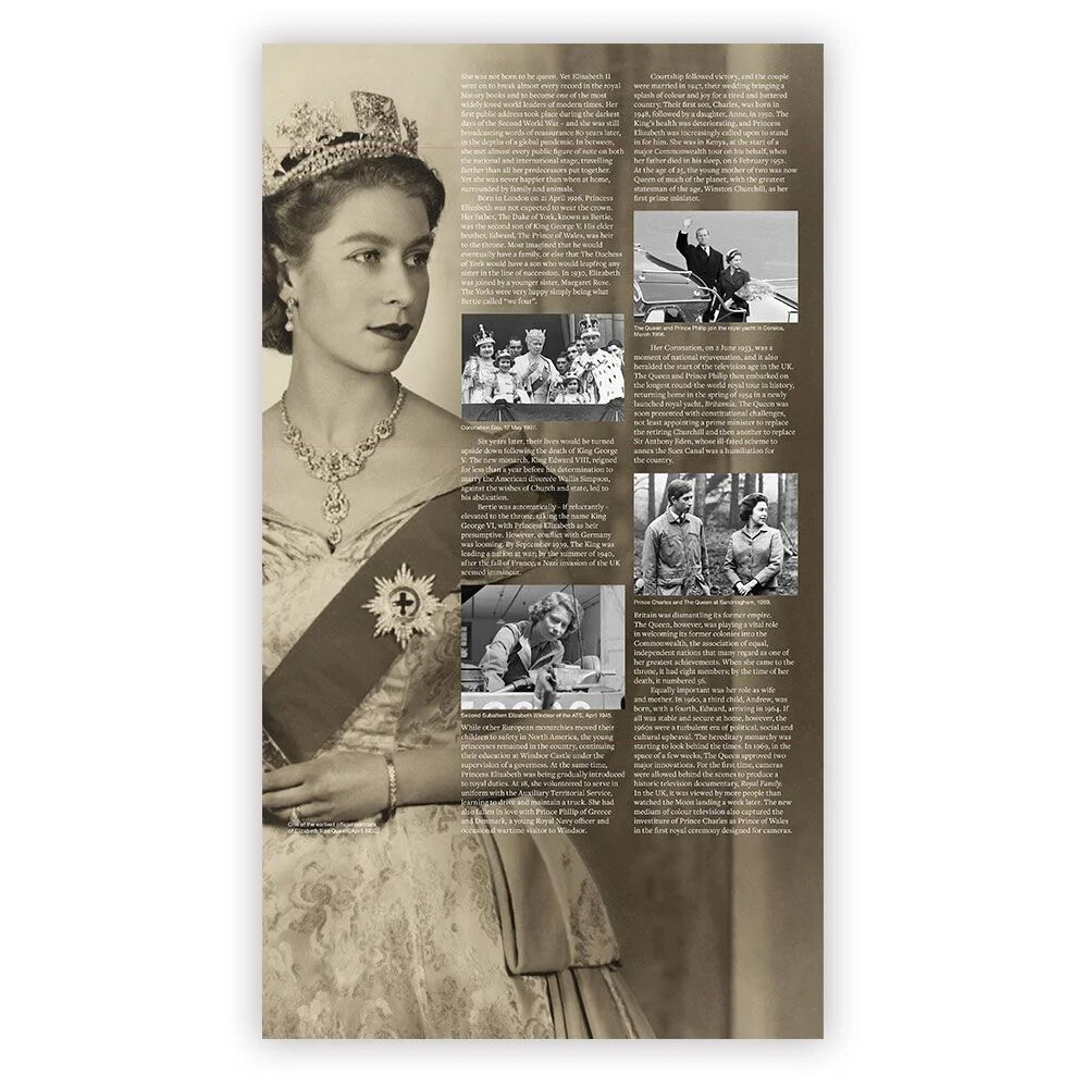 A fascinating, fact-packed souvenir featuring all eight main stamps in mint condition alongside stories and images spanning Queen Elizabeth II’s remarkable life.