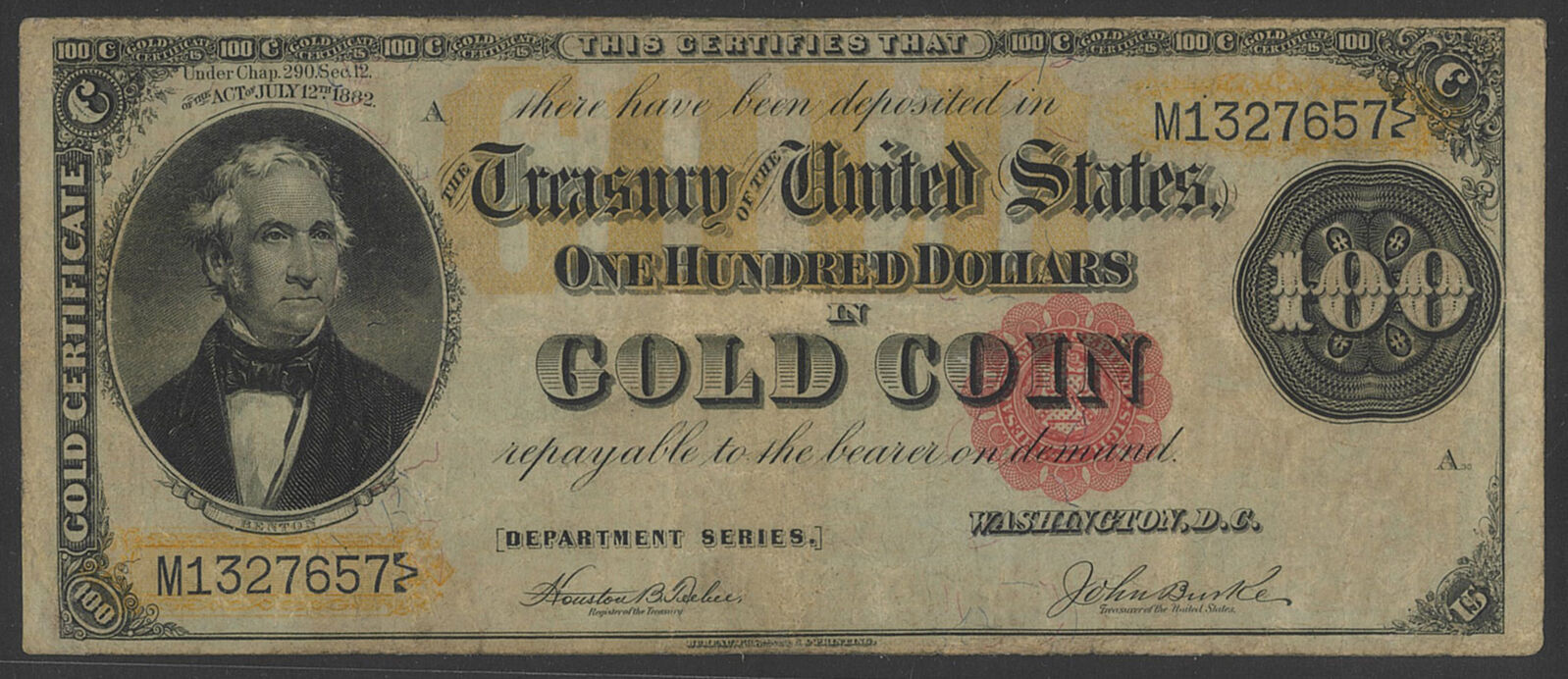 A distinguished example of early American large‑size currency, this 1882 $100 Gold Certificate represents one of the most iconic issues of the late 19th century. Printed during an era when paper money was directly backed by gold held by the U.S. Treasury, these notes were redeemable “in gold coin,” giving them both monetary and historical significance.