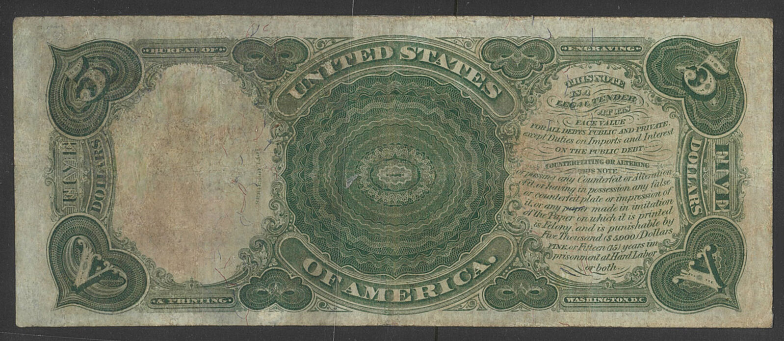 The note also features a portrait of Andrew Jackson at left, along with the classic red seal and serial numbers characteristic of United States Legal Tender issues of the era. Its large‑size format, intricate engraving, and strong visual appeal make it a cornerstone piece for any U.S. paper money collection.