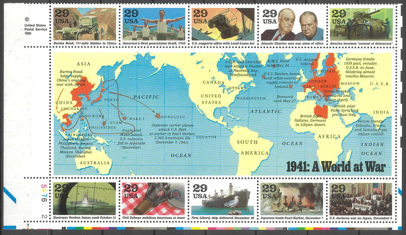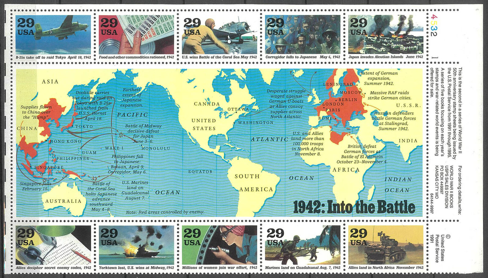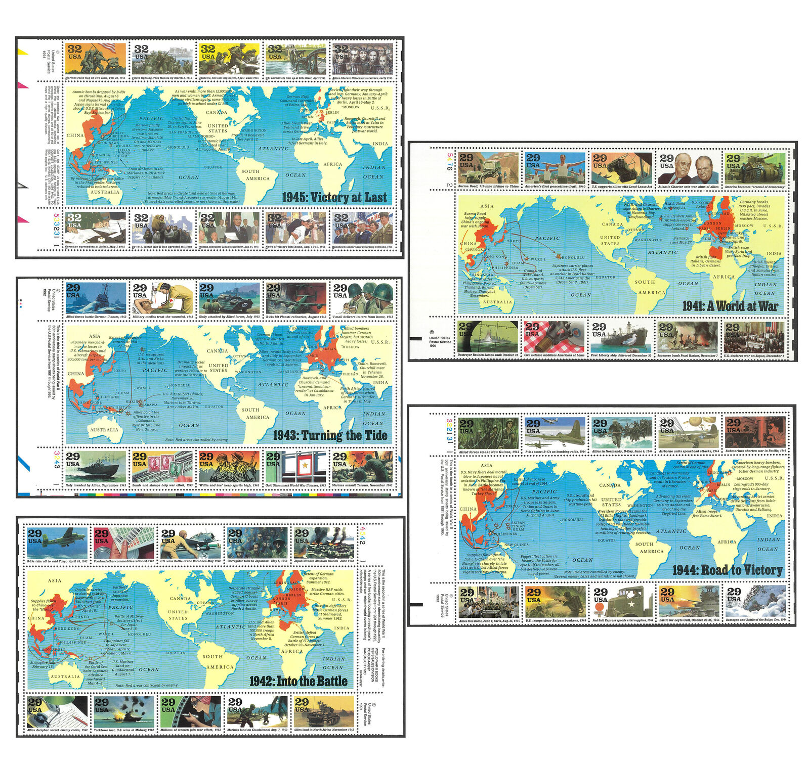 USA 1991-95 World War II Set of 5 Blocks/10 Stamps Mint Unhinged, Scott 2559. 2697, 2765, 2838, 2981