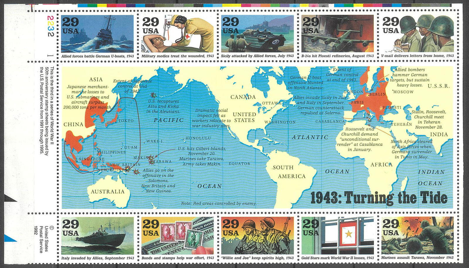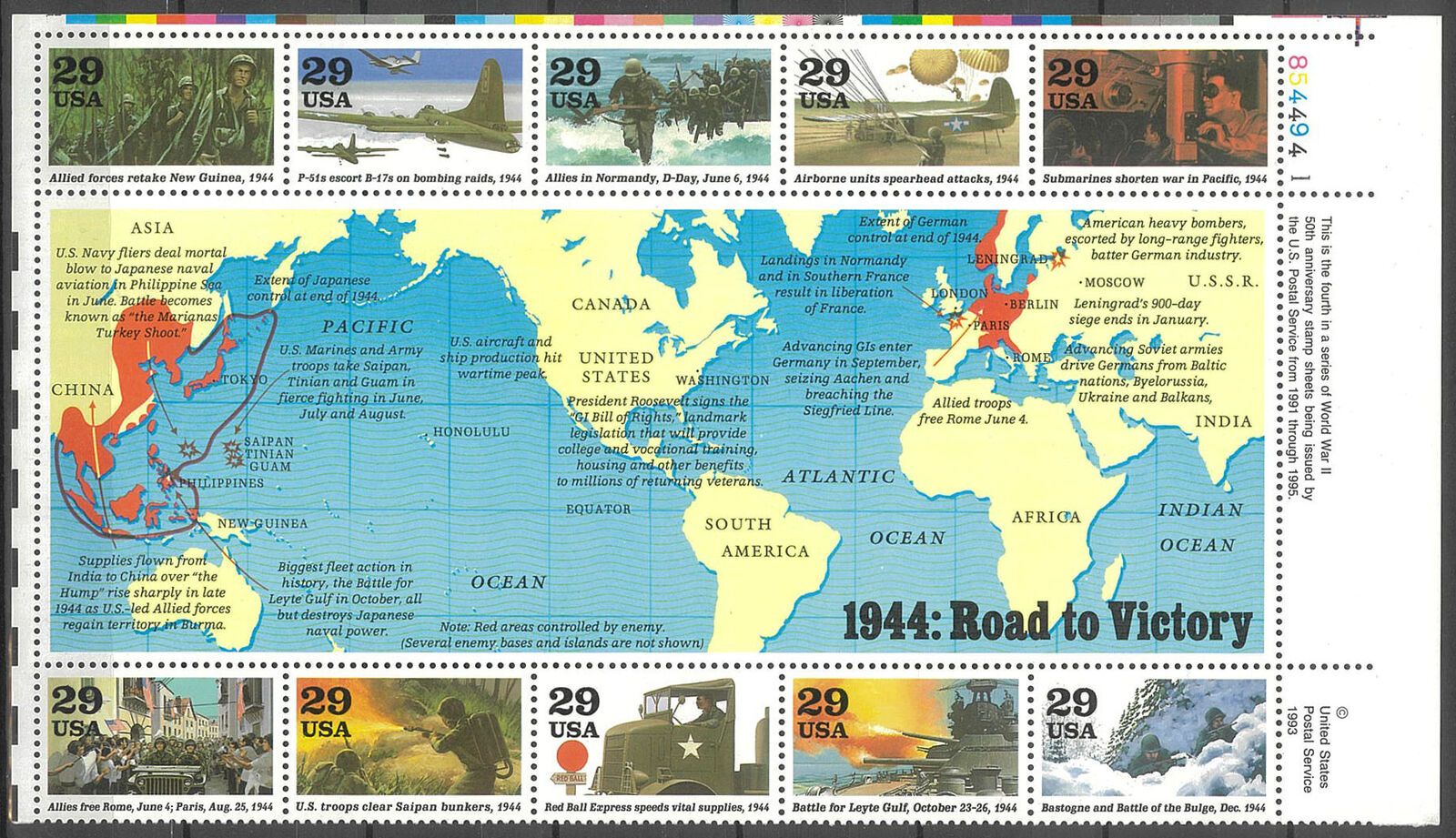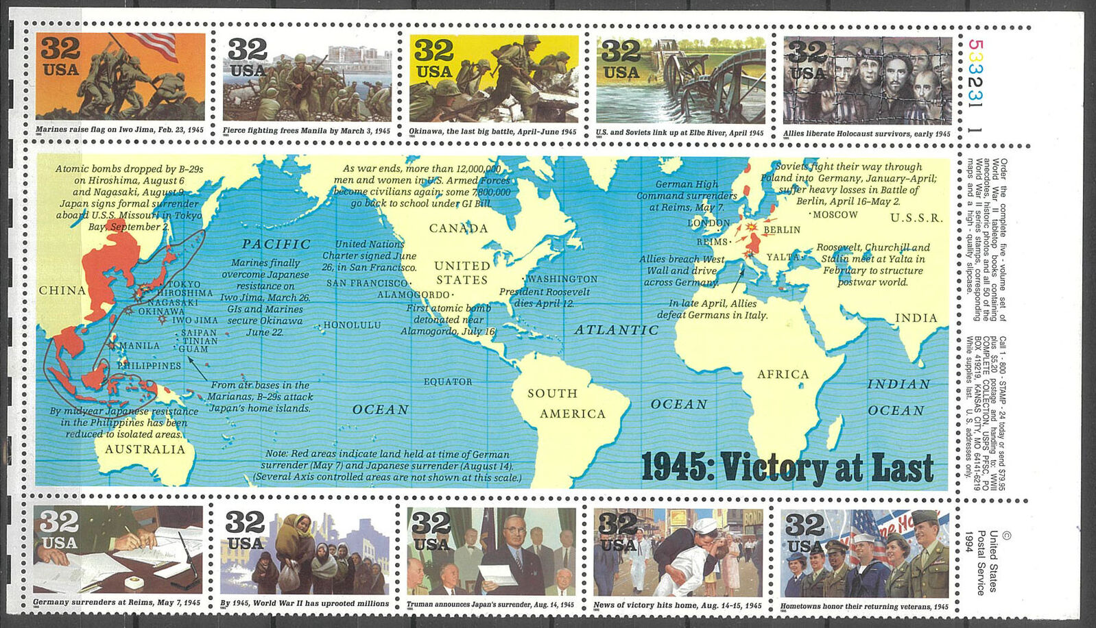 USA 1991-95 World War II Set of 5 Blocks/10 Stamps Mint Unhinged, Scott 2559. 2697, 2765, 2838, 2981