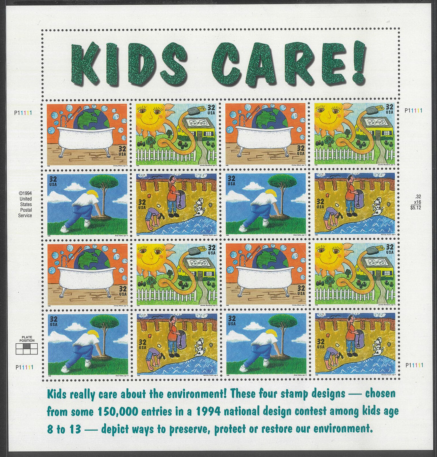 USA 1995 Kids Care 32c Sheetlet/16 Stamps Scott 2954a Mint Unhinged #US26