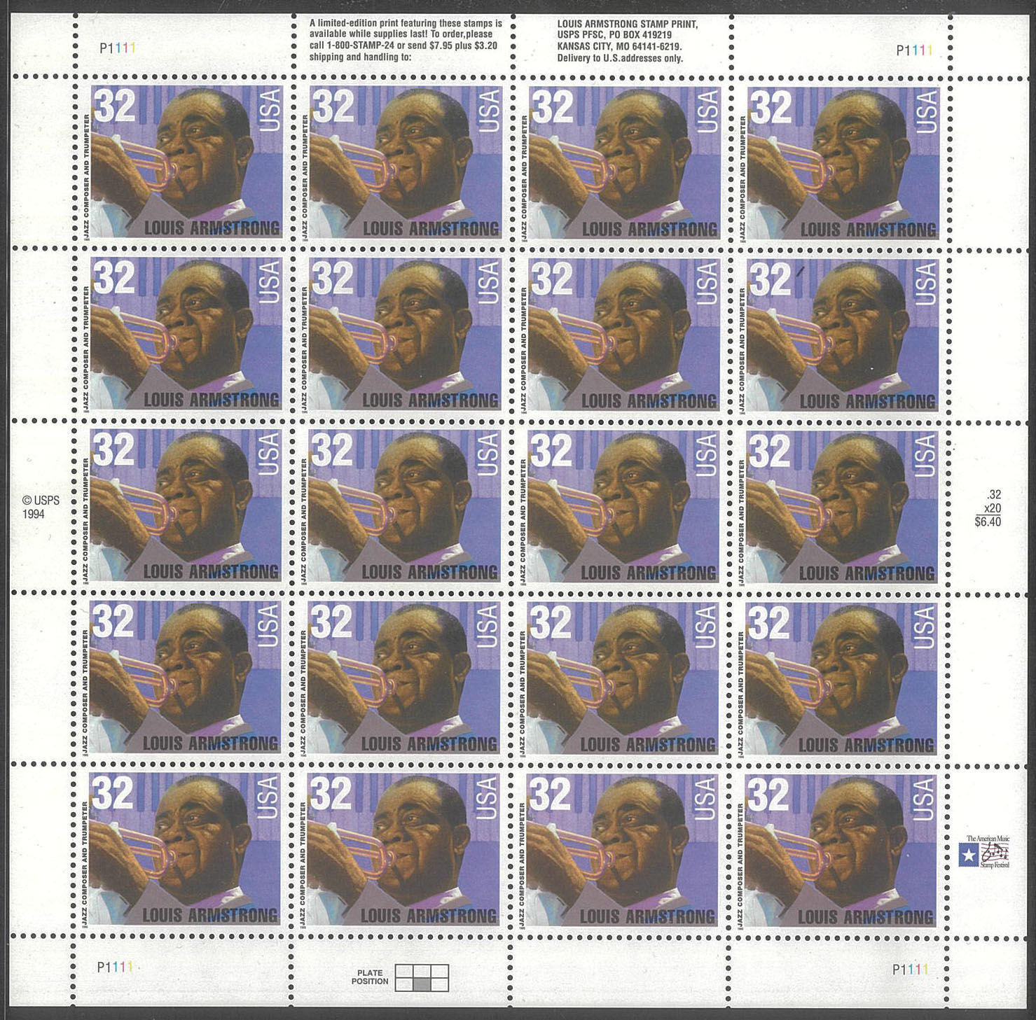 USA 1995 Louis Armstrong 32c Sheetlet/20 Stamps Scott 2982 Mint Unhinged #US27