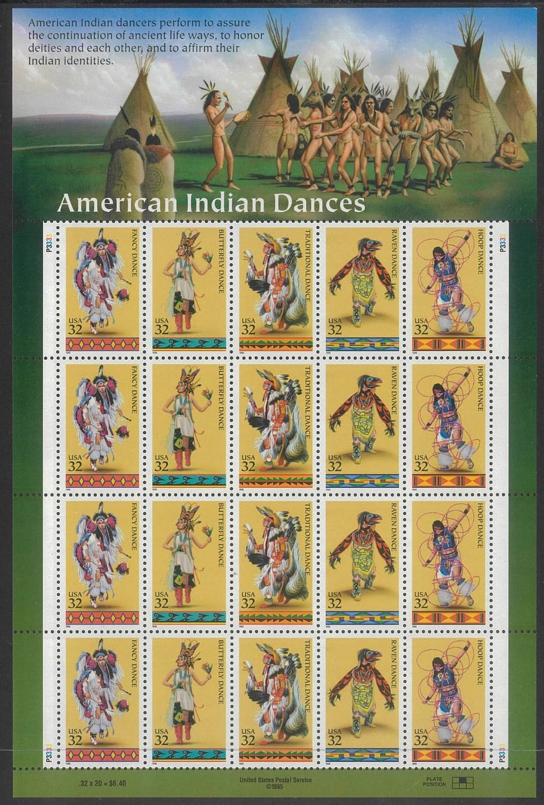 USA 1996 American Indian Dances 32c Sheetlet/20 Stamps Scott 3076a MUH #US32