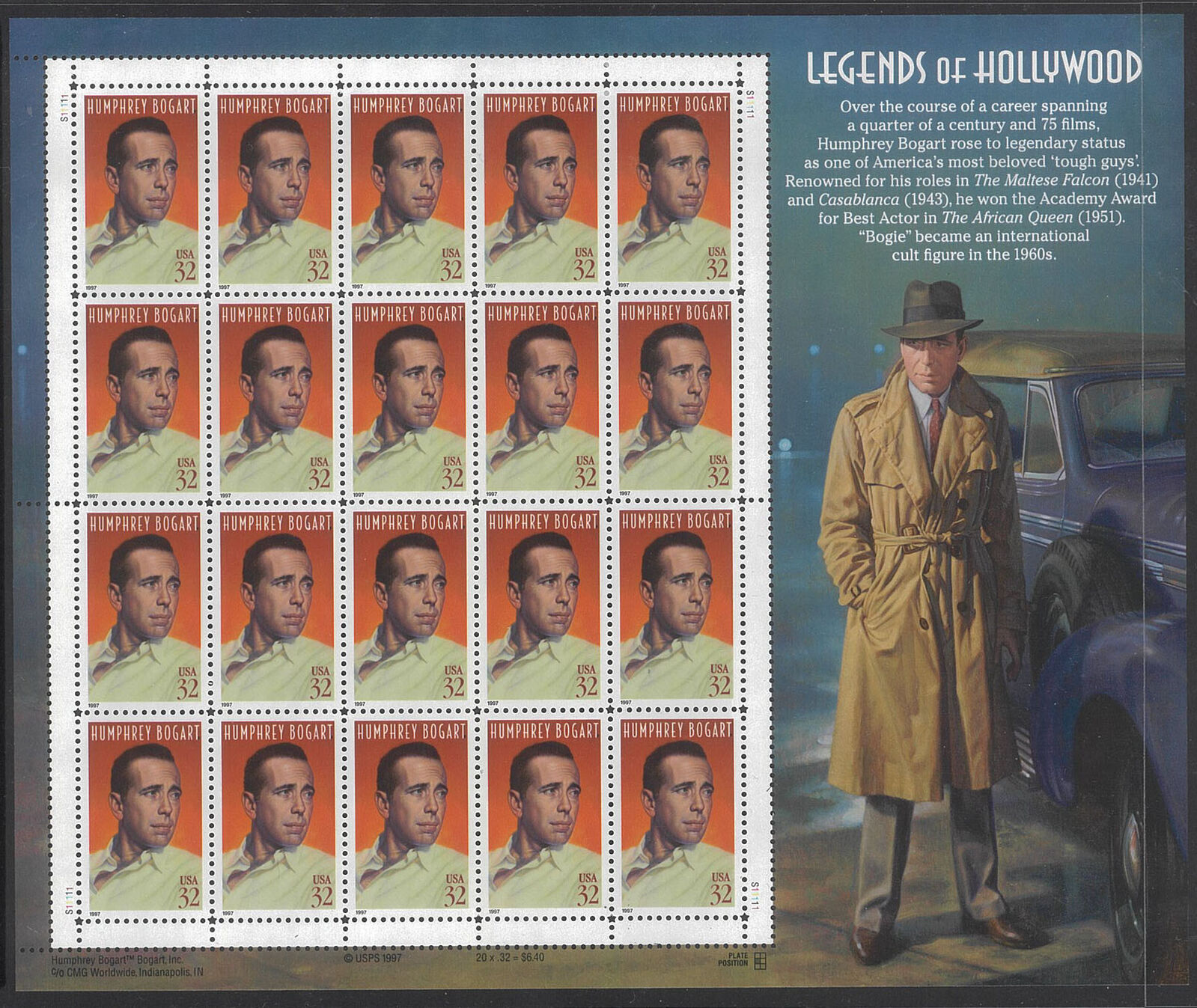 USA 1997 Humphrey Bogart 32c Sheetlet/20 Stamps Scott 3152 MUH #US40