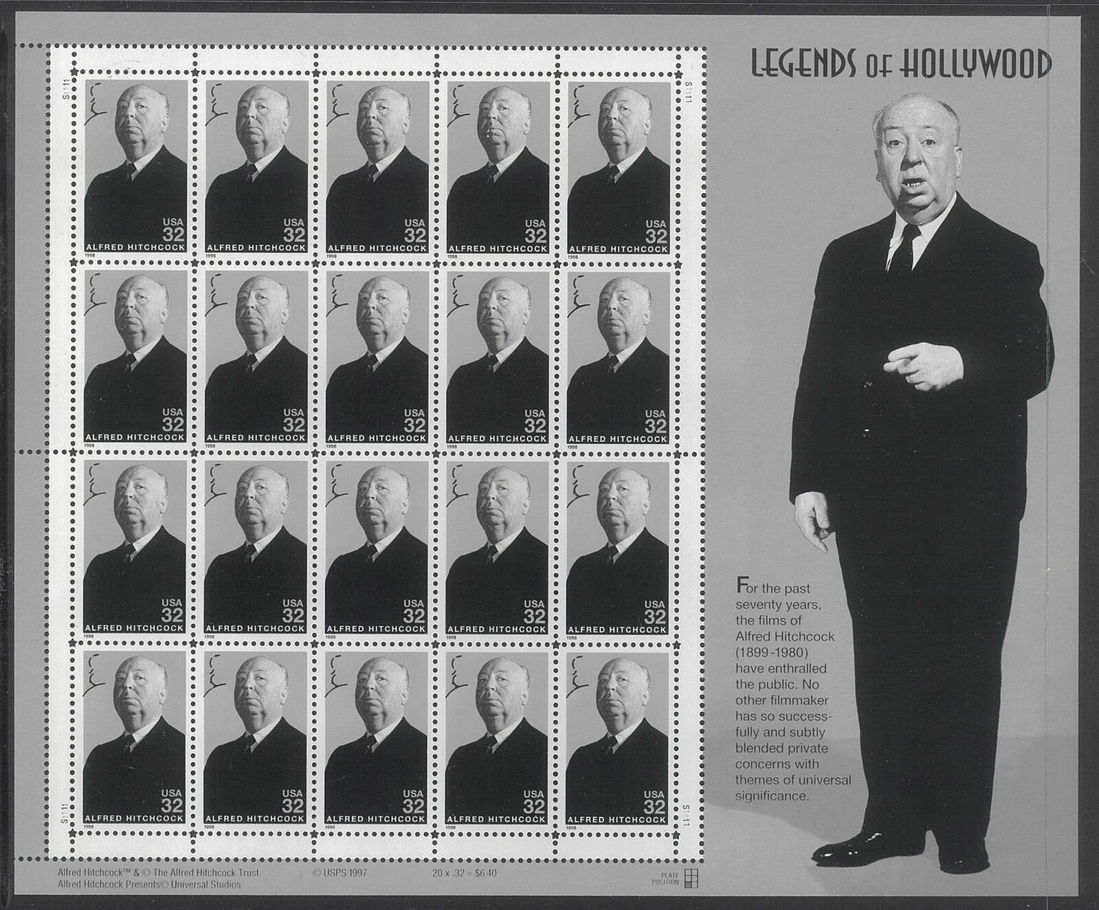 USA 1998 Alfred Hitchcock 32c Sheetlet/20 Stamps Scott 3226 MUH #US45