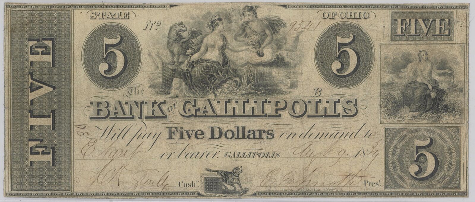 USA Bank of Gallipolis 1839 $5 Banknote – Good Fine / About Very Fine