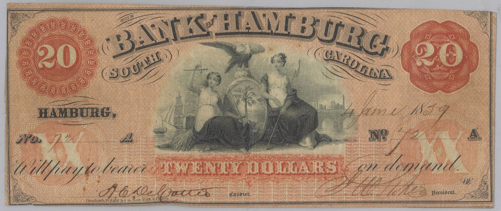 Add a rare antebellum artifact to your collection with this Bank of Hamburg, South Carolina 1859 $20 banknote, offered in Very Fine (VF) condition.