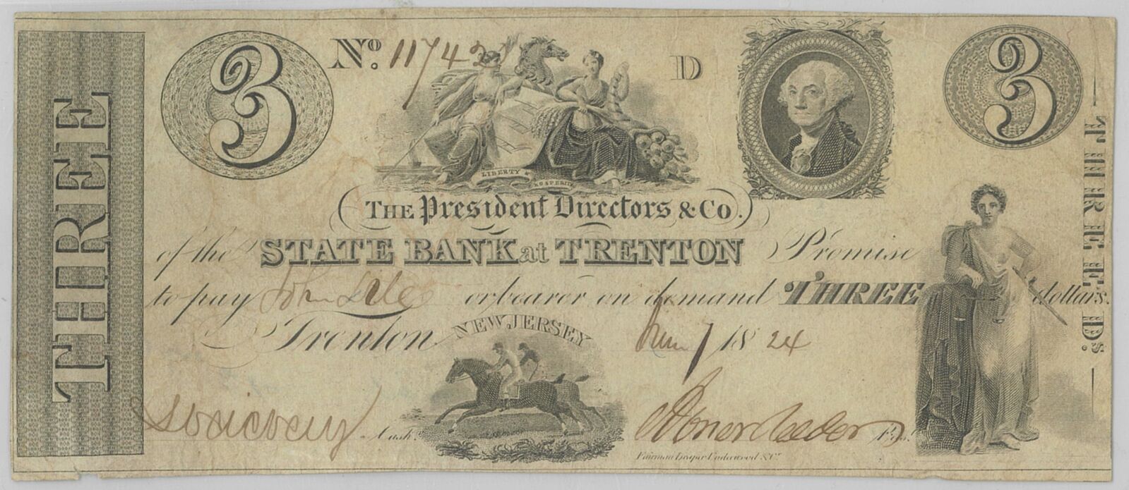USA State Bank at Trenton 1824 $3 Banknote – Very Fine Plus (VF+)