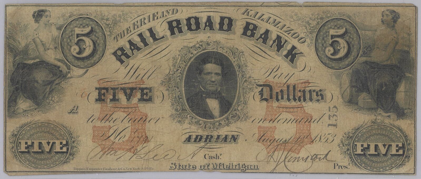 USA Erie & Kalamazoo Railroad Bank 1853 $5 Banknote – Good Fine