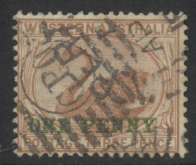 Western Australia 1893 One Penny on 3d Swan Brown WMK Crown CA SG109 FU #AUBK
