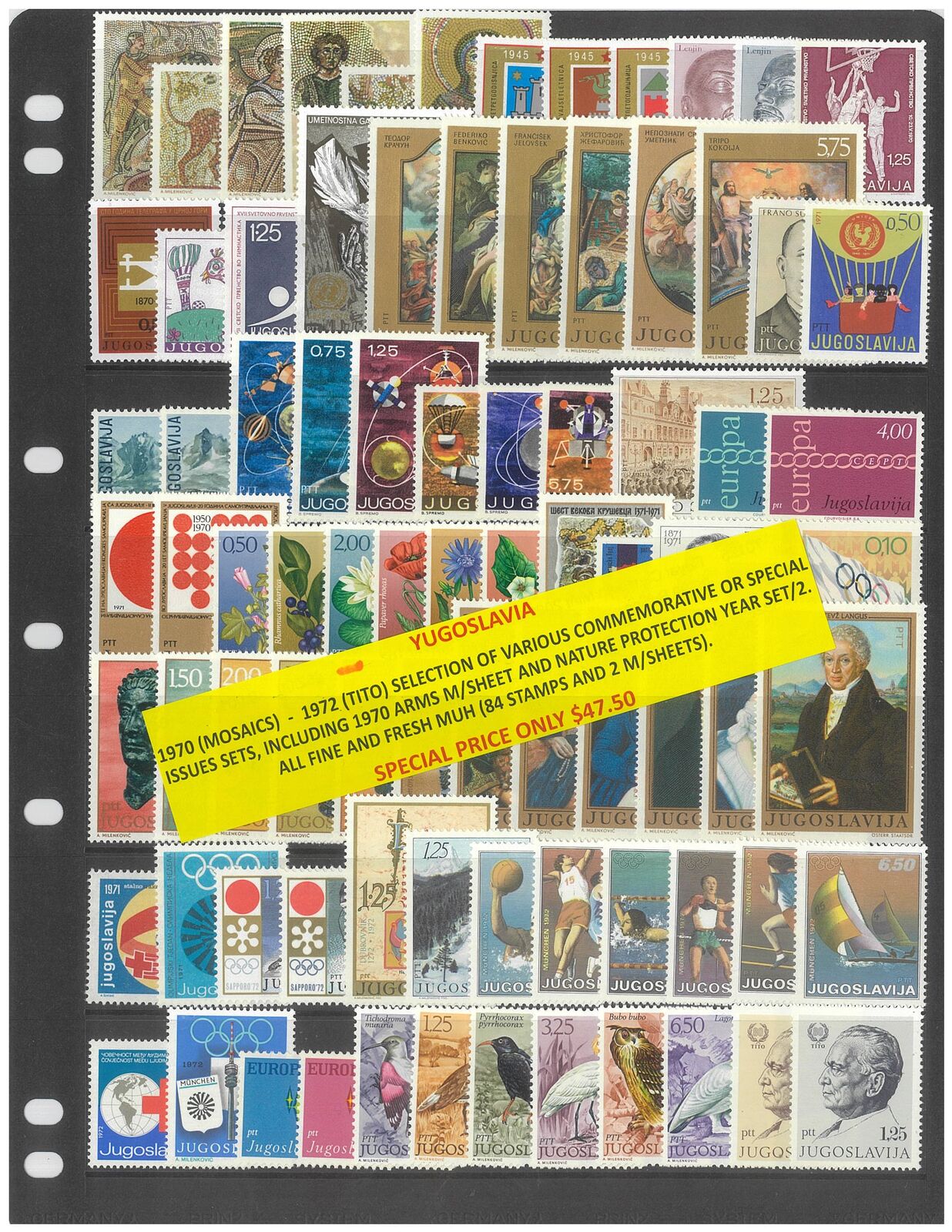 Yugoslavia 1970 (Mosaics) - 1972 (TITO) Selection of Commemorative Sets, including 1970 Arms mini sheet and Nature Protection year set of 2. 84 Stamps & 2 Mini Sheets MUH #449